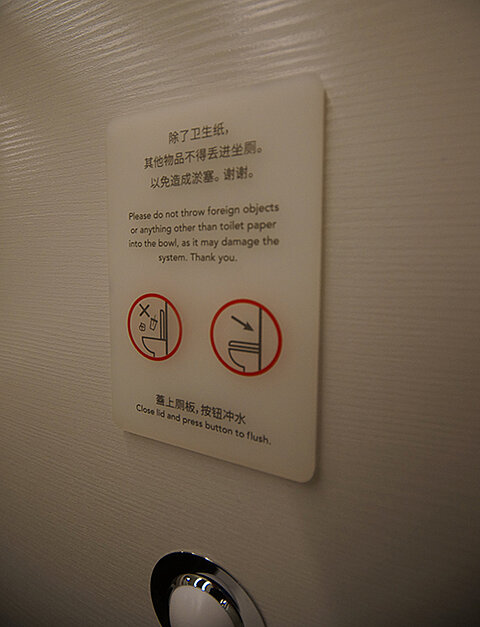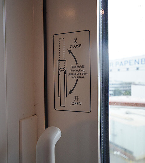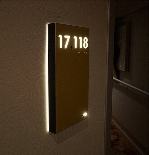 Zimmernummer mit vielseitigen Funktionen: Kabinenschilder nehmen Post auf, leuchten galant, haben eine haptische Nummer für sehbehinderte Menschen, zeigen über einen Lichtpunkt, ob die Kabine frei oder besetzt ist und fügen sich in Form und Gestaltung dem Innendesign an. Im Innenbereich der Kabine leisten informative und sicherheitsrelevante Schilder ihre Dienste.